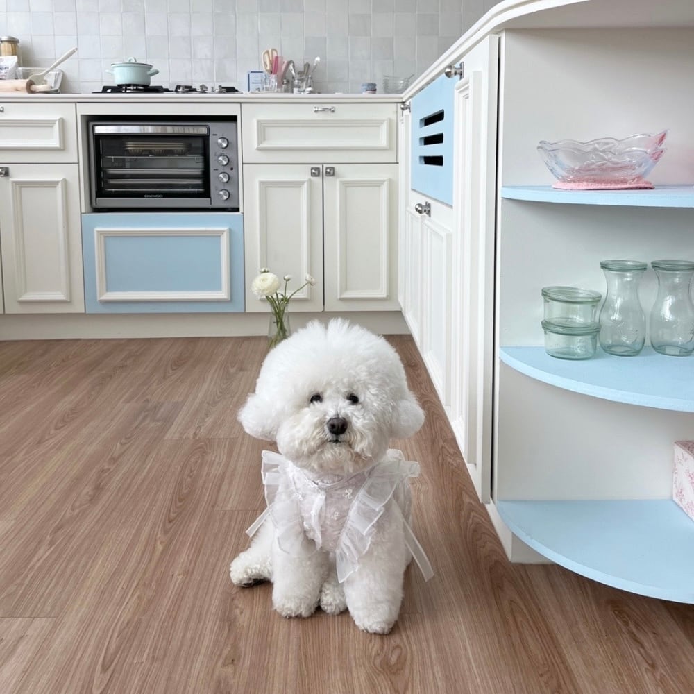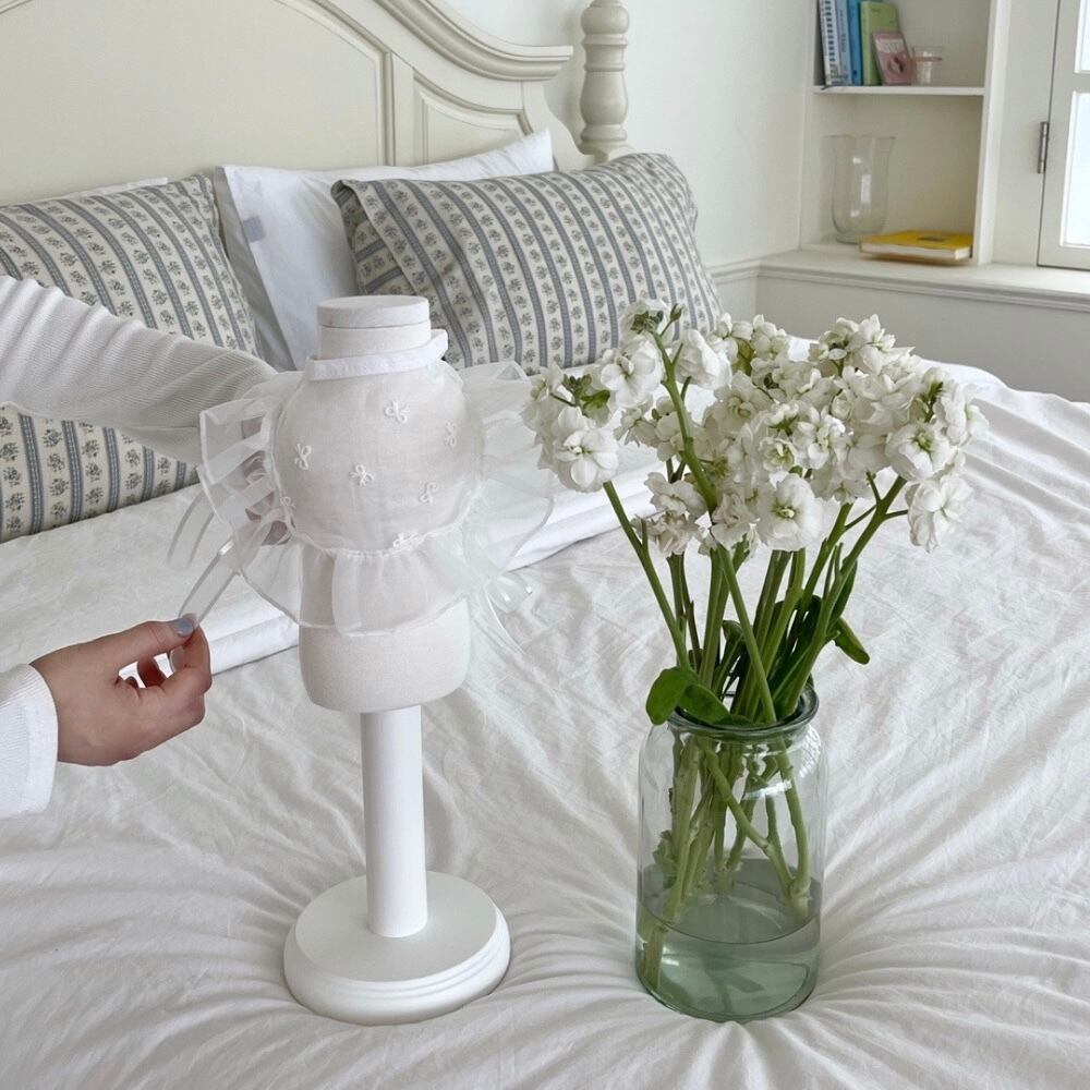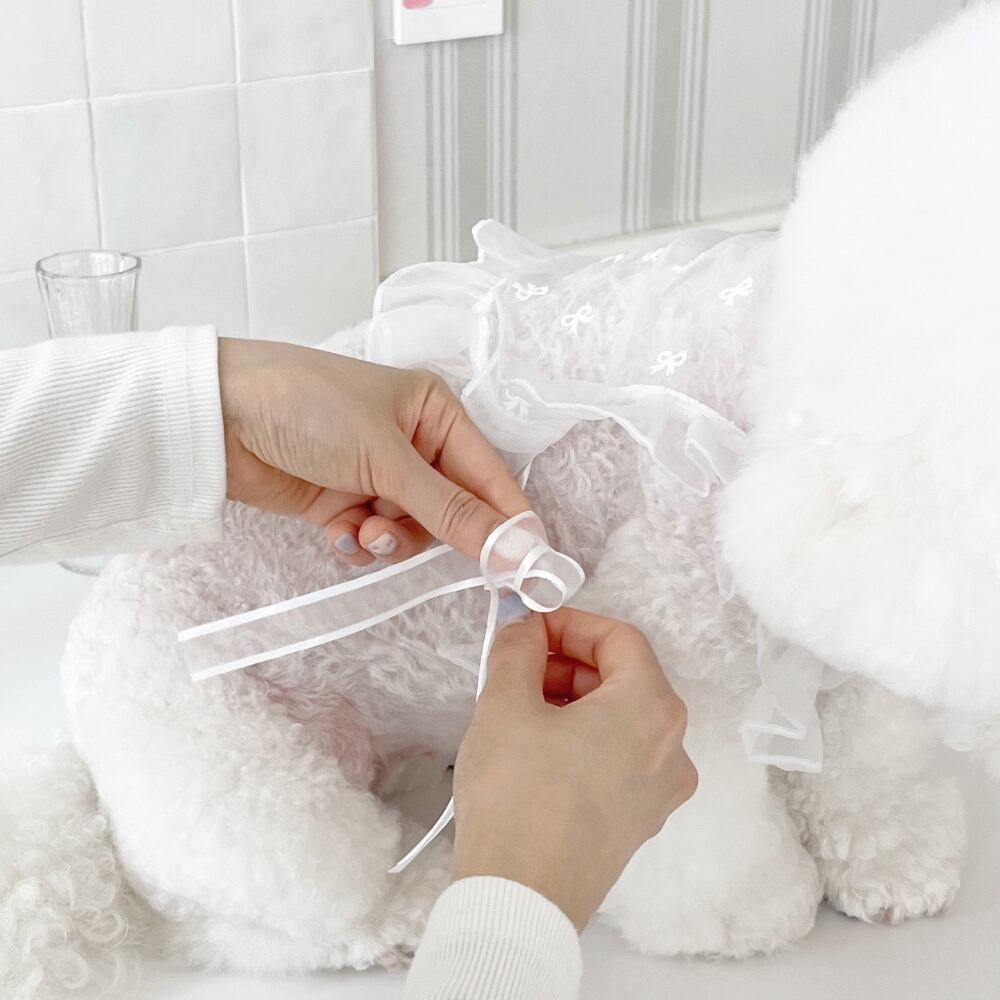 ワンちゃんの体型に合わせてリボン紐をきゅっと結ぶだけで、やさしくフィットし、着ていないかのような軽やかな着心地 ୨୧
