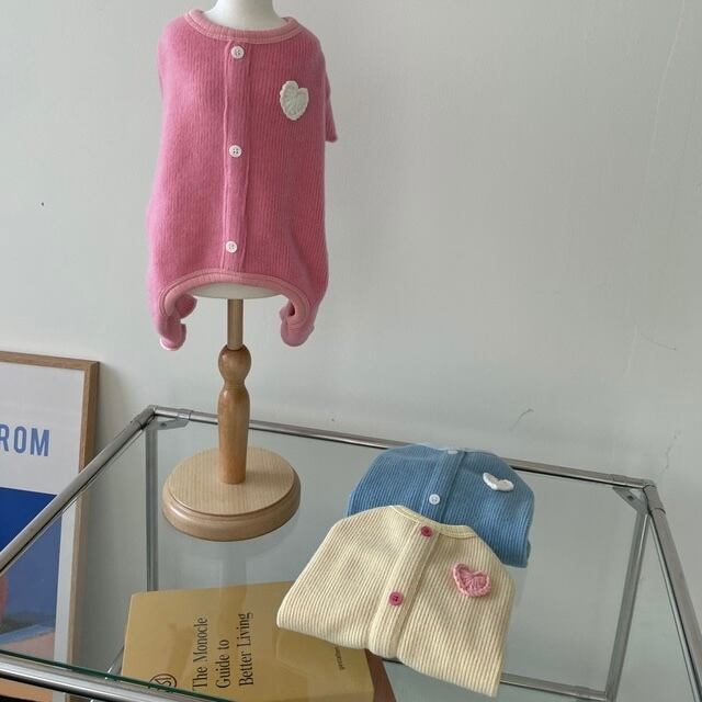 胸元の編みハートモチーフはハンドメイドで、