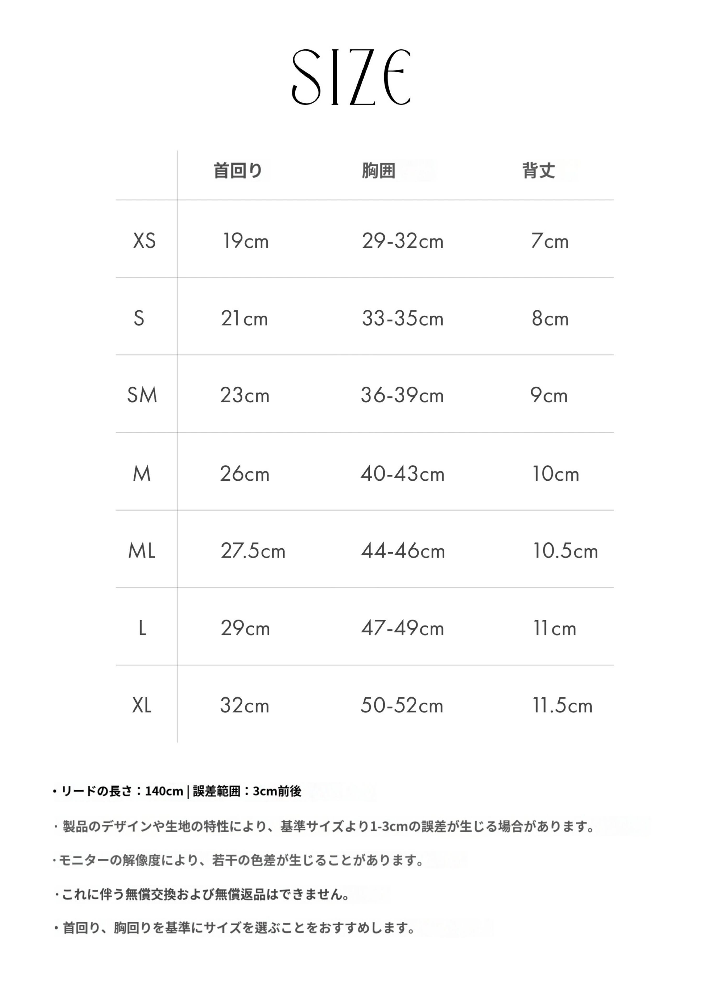 SM:首回り23cm / 胸囲36〜39cm / 背丈9cm