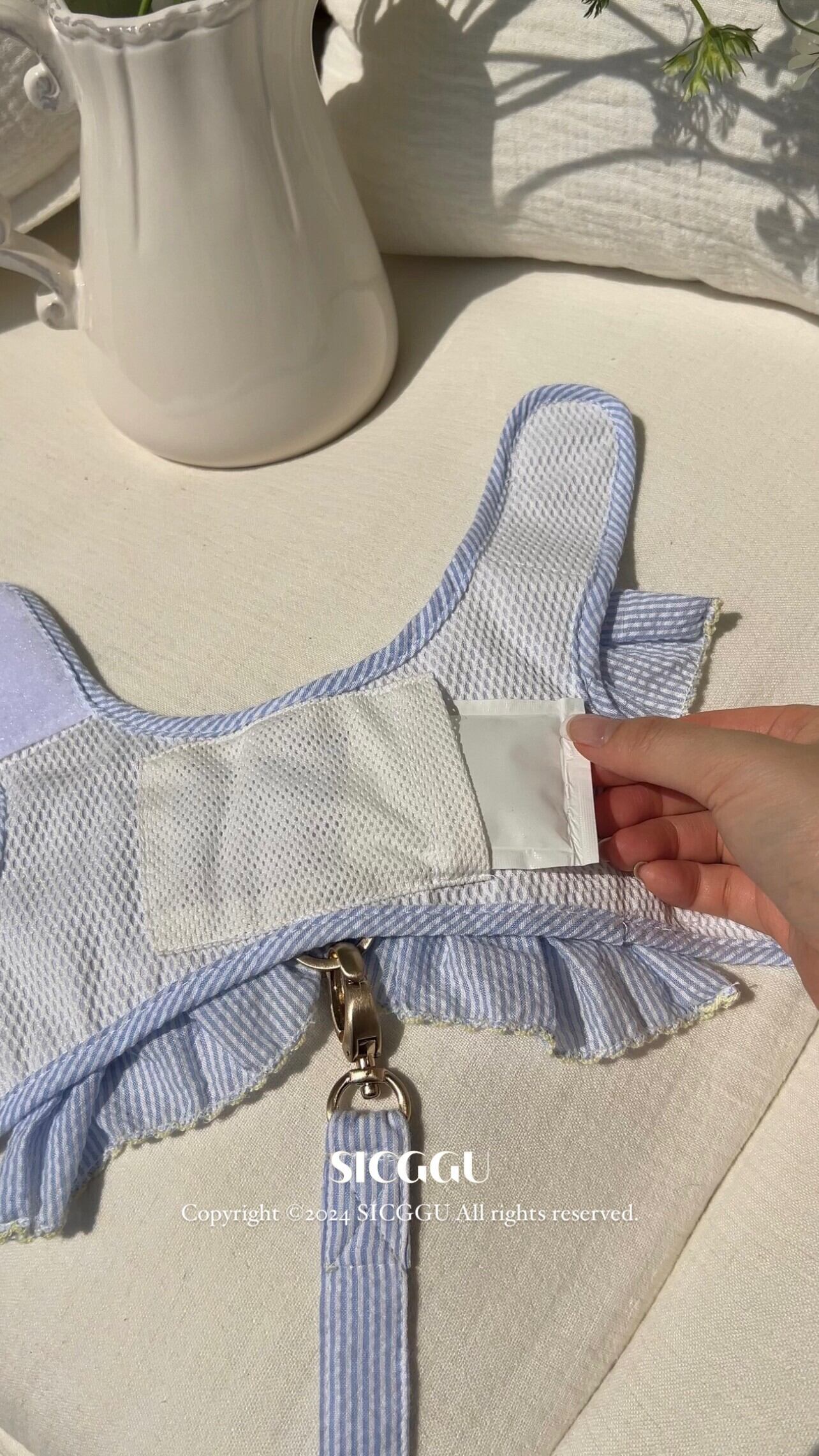涼しげなシアサッカー素材と通気性の良いメッシュ裏地を使用した暑い日ににぴったりのハーネスです。