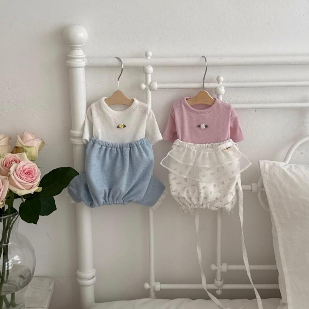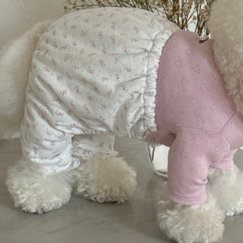 ハートアイレット素材のトップスに、フラワーパターンのパンツを組み合わせ、裾にはレースをあしらうことで着るだけでぐっと可愛いシルエットに。