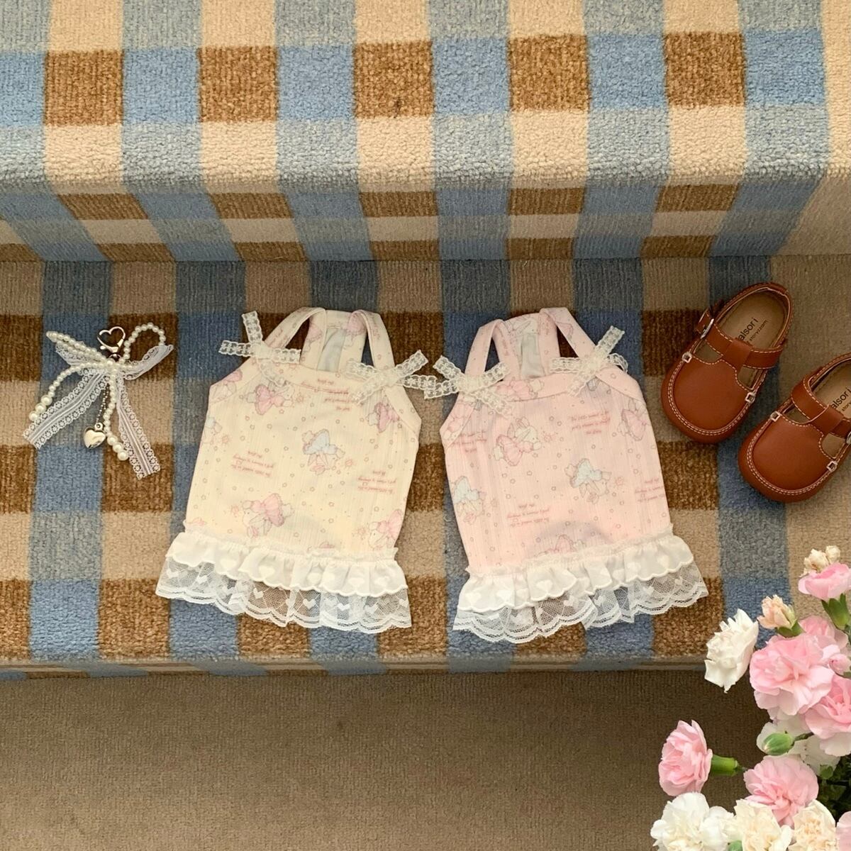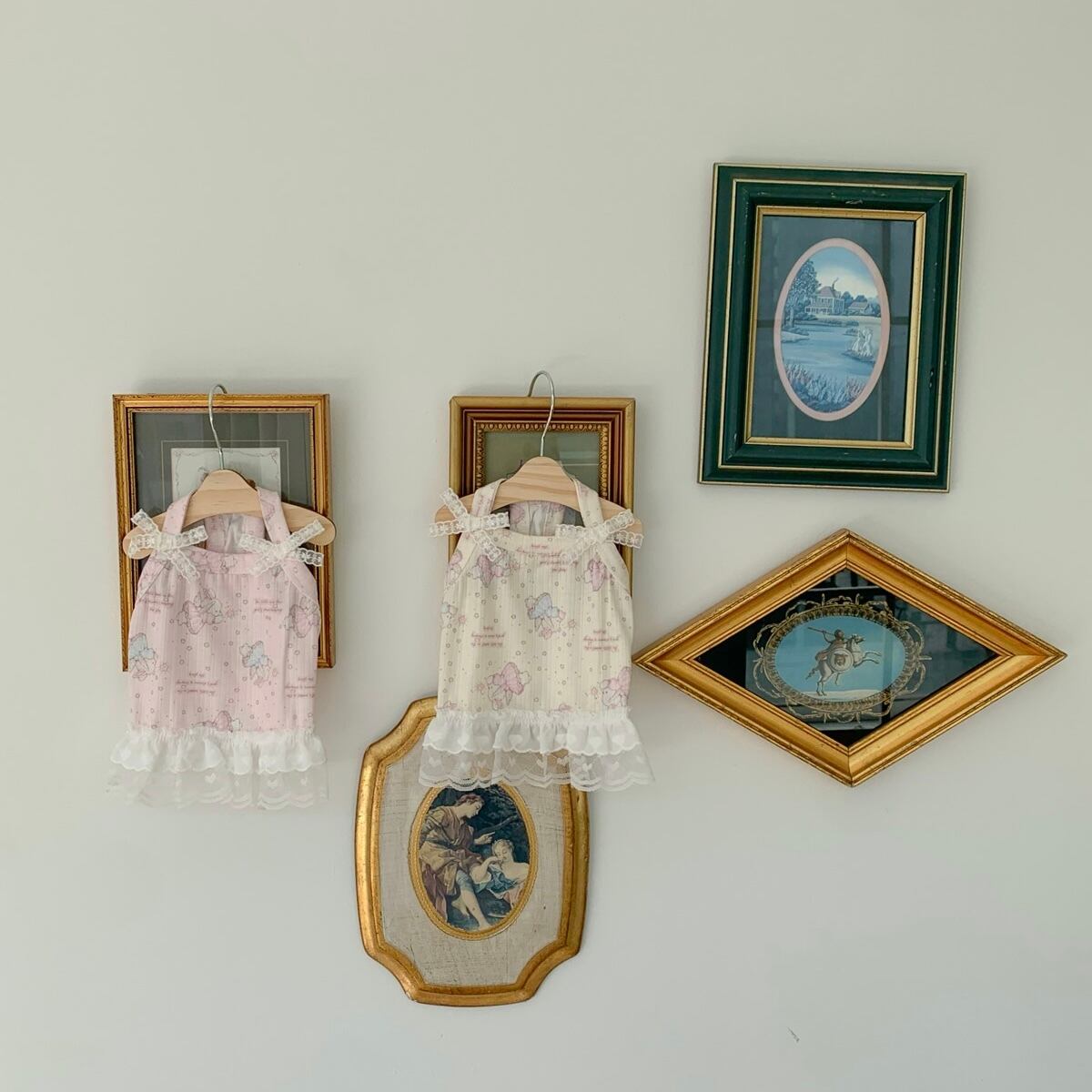 裾にはふんわりとしたレースフリル、肩には繊細なレースリボンをあしらい、より上品で可愛らしい印象に仕上げました。