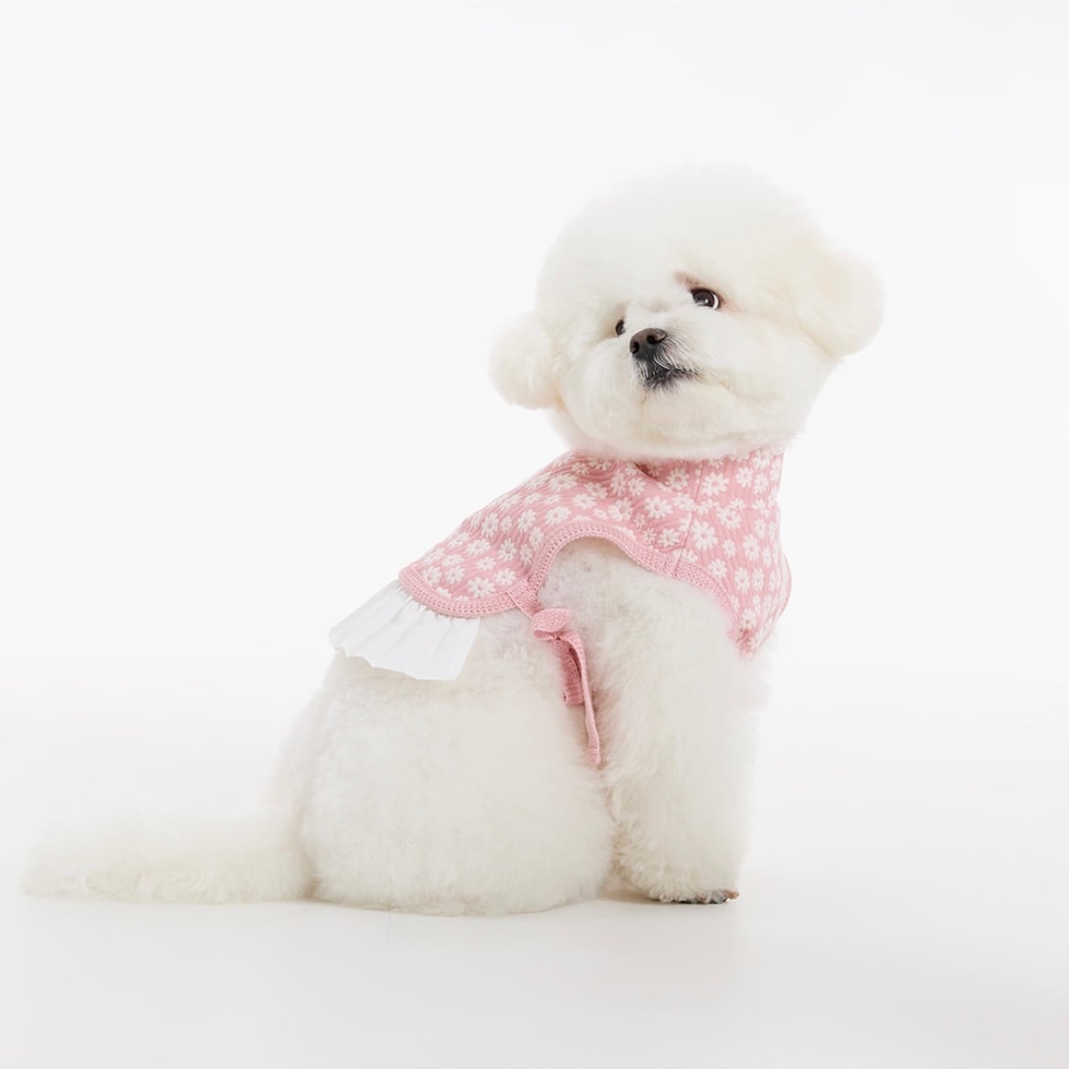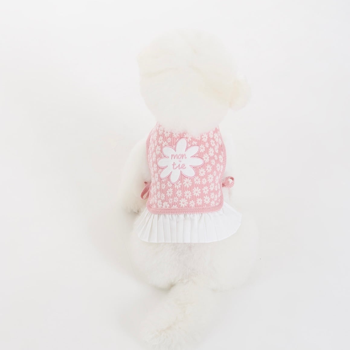 ホワイトのプリーツスカートがふんわりと広がり、やわらかく愛らしいシルエットを演出。
