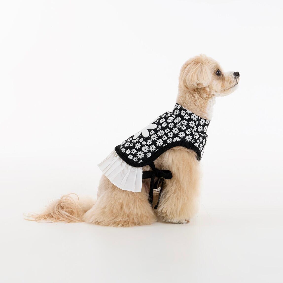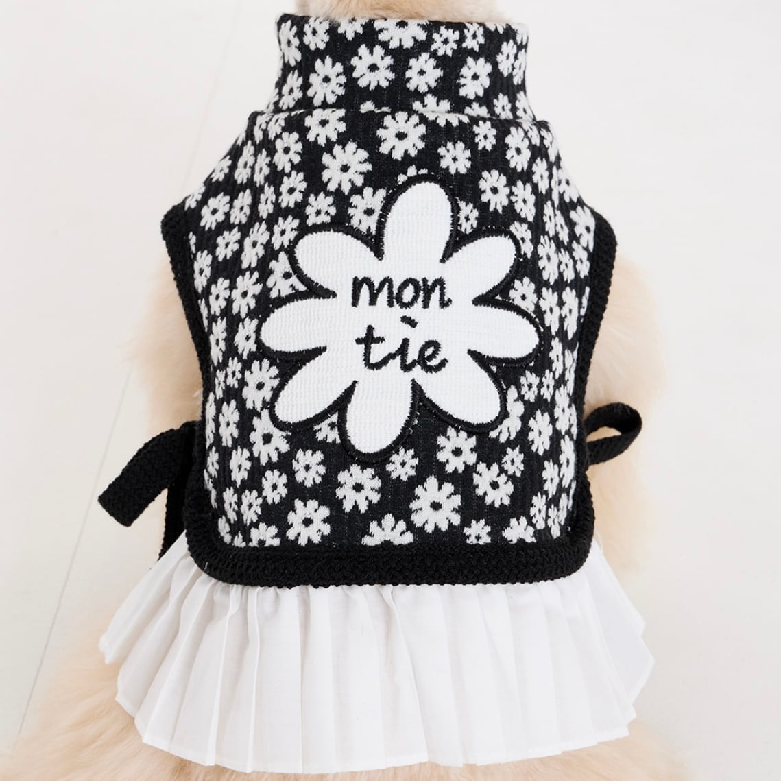 ホワイトのプリーツスカートがふんわりと広がり、やわらかく愛らしいシルエットを演出。