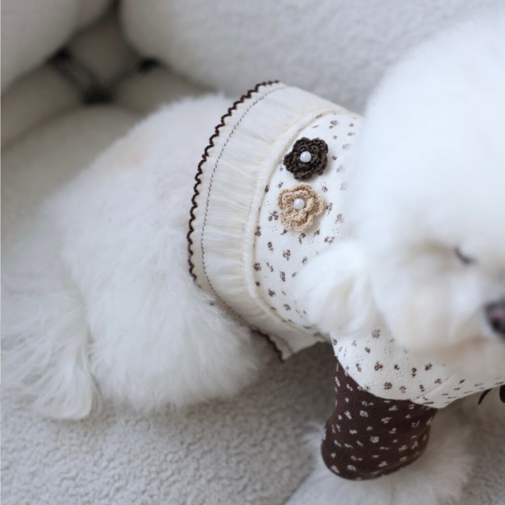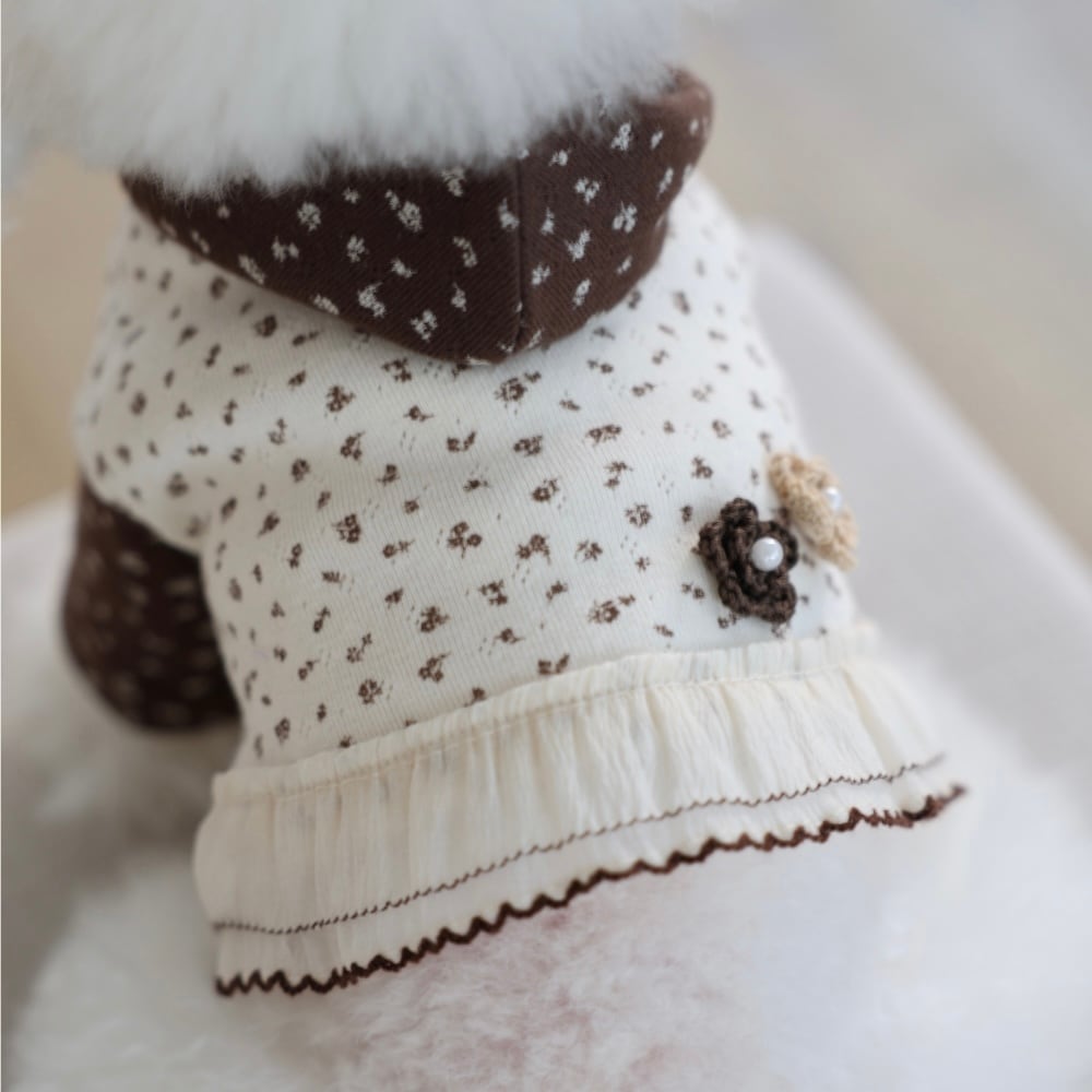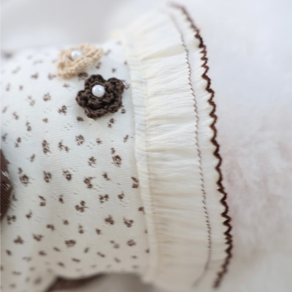 ハンドメイドのお花や小さなリボン、フード部分のレース仕上げがポイントになったとても愛らしいデザインです。