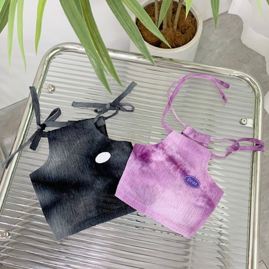 肩のリボンがアクセントになった、とても愛らしいタイダイ柄のノースリーブです。