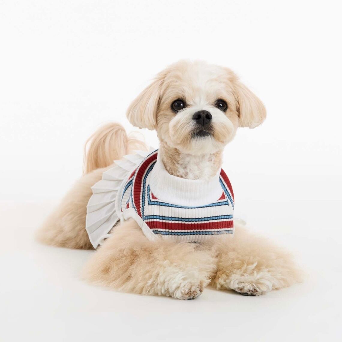 ストライプトップとプリーツスカートの組み合わせで、1枚でコーデが完成するデザインに。